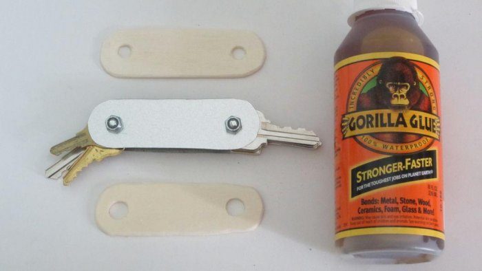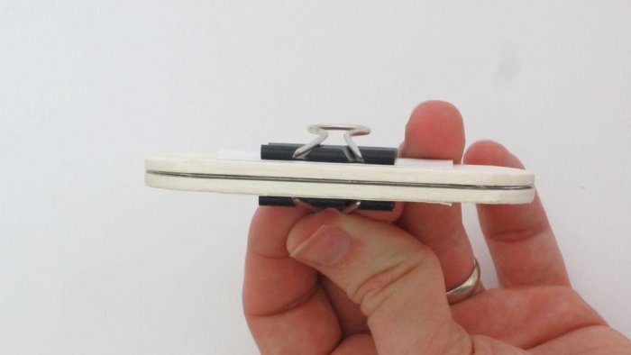 Наклеиваем деревянные накладки на металлические пластины, используя подходящий клей. До полного отвердения клея сдавливаем их двумя зажимами.