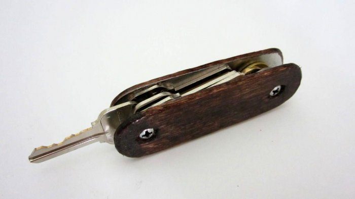 Такой брелок состоит из полой ручки, образованной двумя боковыми пластинами, которые с двух сторон стянуты болтами, которые одновременно являются осями для двух наборов ключей. Их можно повернуть в ручку для компактного хранения или выдвинуть наружу, чтобы открыть замок.