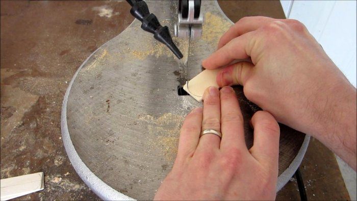 Используя подходящий круглый предмет, делаем разметку концов деревянных накладок в виде полукруга. С помощью лобзика придаем им окончательную форму.