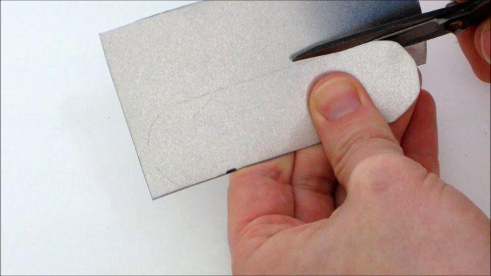 Затем, используя как шаблон деревянную накладку, переносим ее контур на металлический лист и с помощью ножниц по металлу вырезаем две одинаковые пластины.