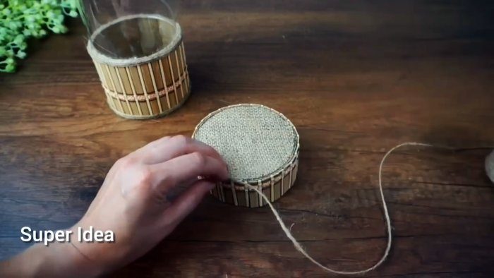 Дополнительно украшаем контейнер натуральным льняным или джутовым шпагатом. Он прекрасно сочетается в отделке с соломенной циновкой и мешковиной.