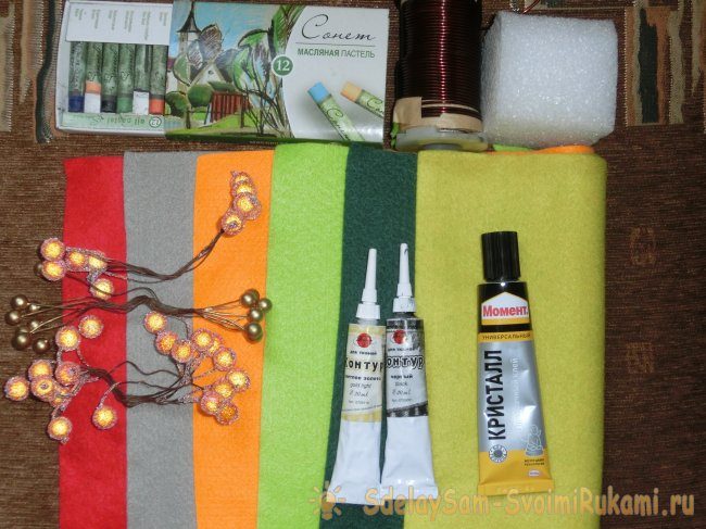 Листы мягкого фетра (красный, желтый, оранжевый, серый, салатовый и зеленый).