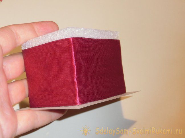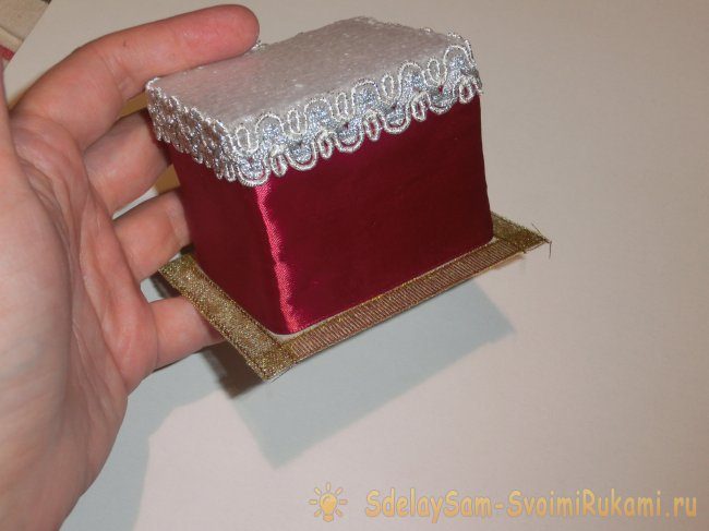 Атласной лентой оберните куб, приклейте ее. По верхнему краю наклейте декоративную тесьму (серебро), а по низу картона золотую ленту.