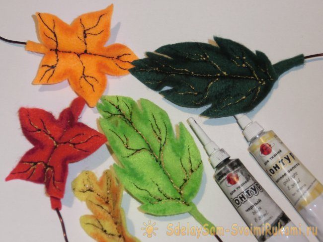 Вначале нанесите черный контур, затем золотой. Оставьте листья на просушку. А пока мы приступим к основанию, на котором будет крепиться наш букет.