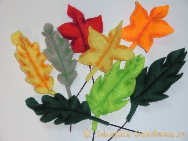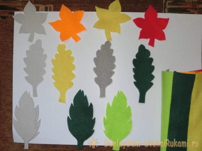 Итак, приступим к делу и примемся изготовлять листья. Для этого на картоне нарисуйте три вида осенних листиков (береза, дуб, клен). Вырежьте шаблоны из картона. Приложив к фетру, обведите их и также вырежьте. Всего должно быть около 7 — 8 листьев. Я сделала два темно-зеленых, один салатовый, два желтых, и по одному из красного серого и оранжевого фетра.