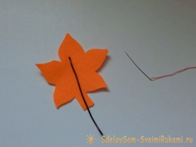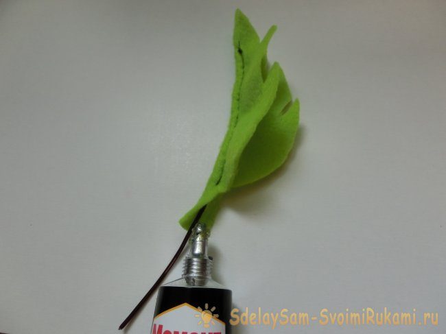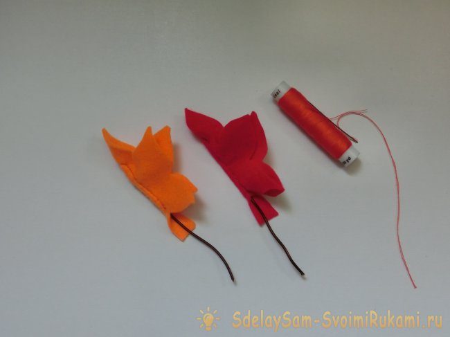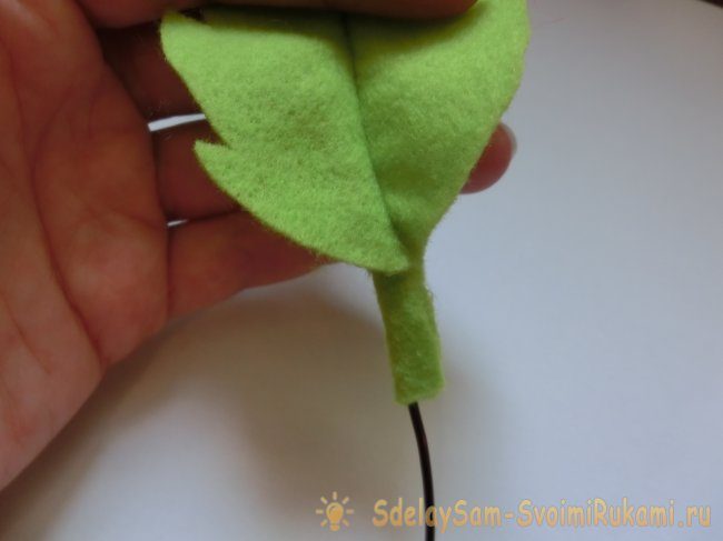 Теперь приложите небольшой отрезок проволоки сверху листка, согните пополам лист и зафиксируйте проволоку ниткой (сделайте шов).