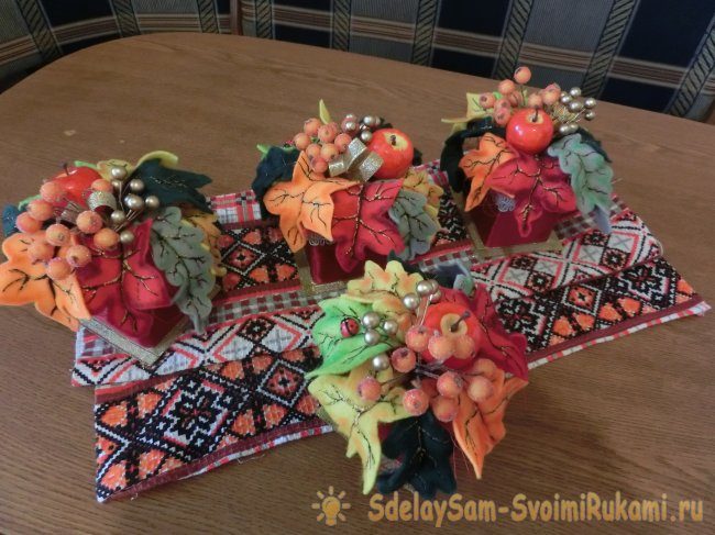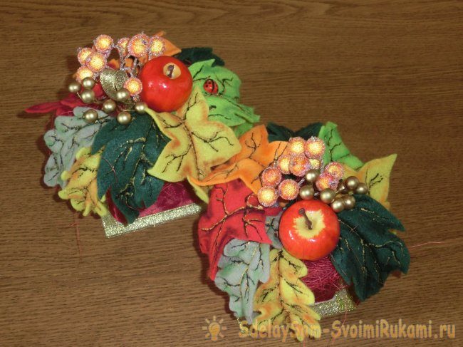 Осталось только собрать букет воедино. Изогните проволоку на листьях, придав им естественный изгиб. Проволочные концы листьев аккуратно воткните в пенопласт, расположив их по кругу. В центр поместите гроздья рябины также на проволоке. Миниатюрное яблочко насадите на проволоку и воткните сбоку от рябины. Букашку наклейте на салатовый листик. Для того чтобы белое дно пенопласта не просвечивалось, уложите под листья соломку бордового или зеленого цвета. Теперь наш осенний букет из фетра для украшения стола готов полностью.