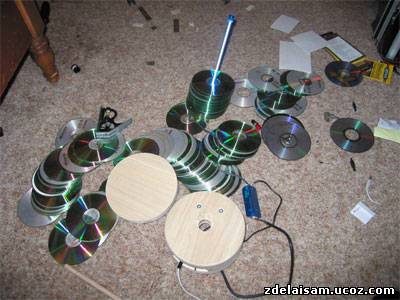 понадобится: куча старых дисков, люминесцентная лампа синего цвета, стандартный светильник для нее, из которого нужно будет взять пускатель, ну и корпус.