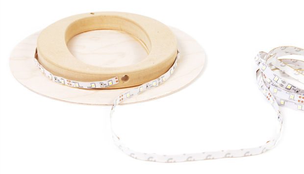 Снимаем защитный слой со светодиодной ленты и приклеиваем полоску по овалу. Провода пропускаем в отверстие снизу.