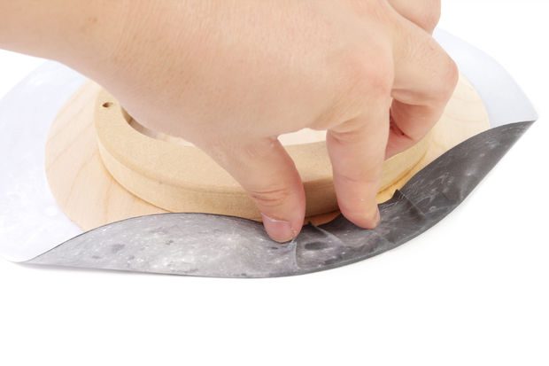 Приклеиваем рисунок луны к круги. Клеим аккуратно, проглаживаем. Края загибаем и формируем юбку. Подождем пока подсохнет клей.