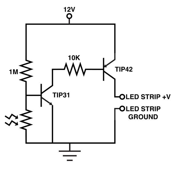 В этой схеме я использовал два транзистора для включения и выключения светодиодной полосы. Первый транзистор реагирует на изменения света и запускает второй транзистор, который отвечает включением и выключением светодиодной ленты.