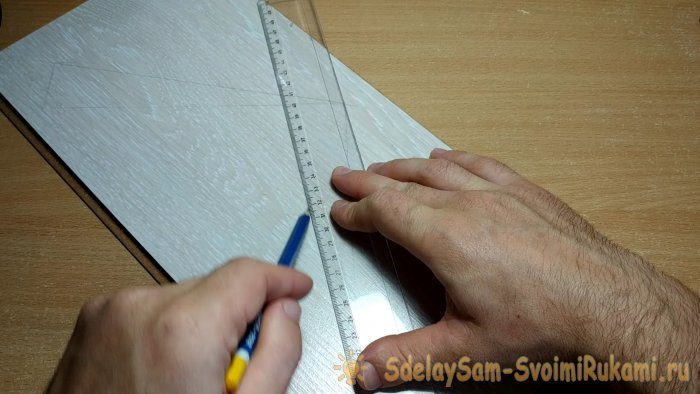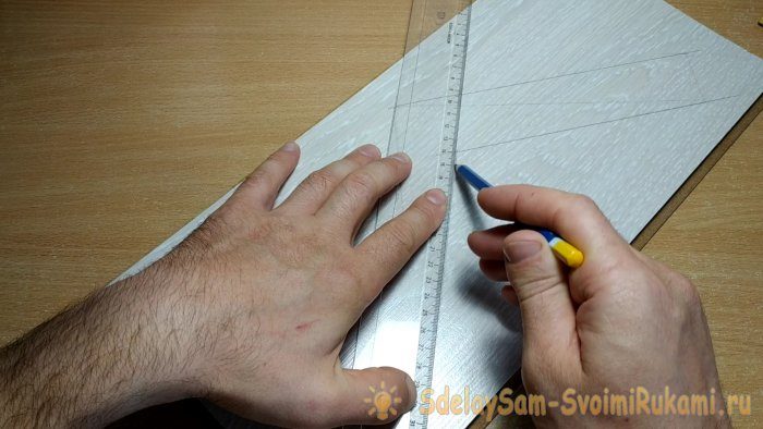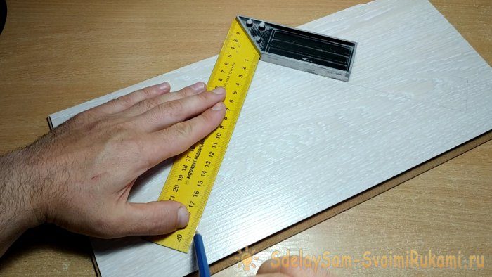 Переворачиваем угольник, выравниваем относительно начерченной линии и повторяем предыдущую операцию еще раз.