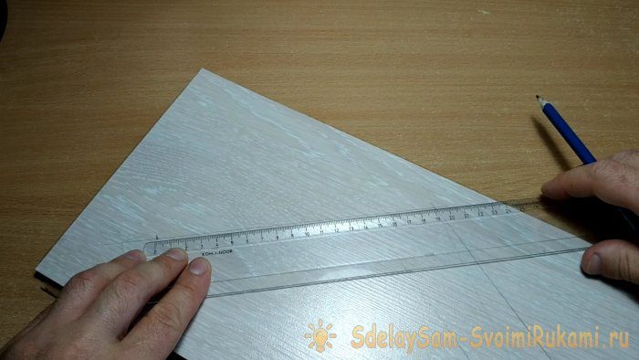 Теперь нужно узнать какой длины у нас получится каждая сторона бумеранга, для этого нужно приложить линейку к внутренним линиям и замерять расстояние до края доски. В моем случае получилось 19 см. от центра к краю.