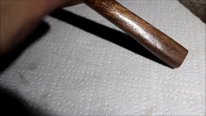 Удаляют остатки ручки с другой стороны молотка, а само деревянное изделие покрывают маслом.