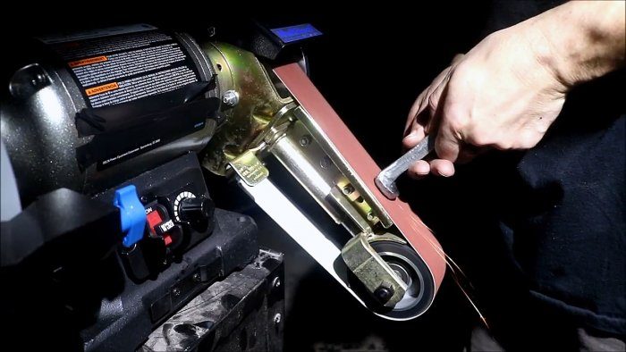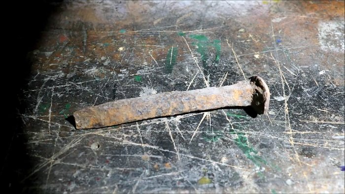 Выбираем железнодорожный костыль. Он должен быть без явных дефектов или деформаций.Костыль зажимаем в тиски, и полностью снимаем с него налет ржавчины. Для этого используем шлифовальную машинку.