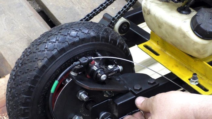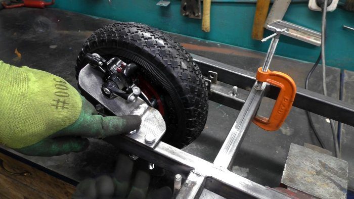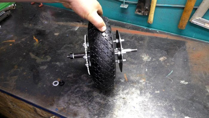 Накидываем приводную цепь на ведомую звездочку колеса и его ось закрепляем на раме. К ранее установленному кронштейну на раме крепим тормозной механизм.