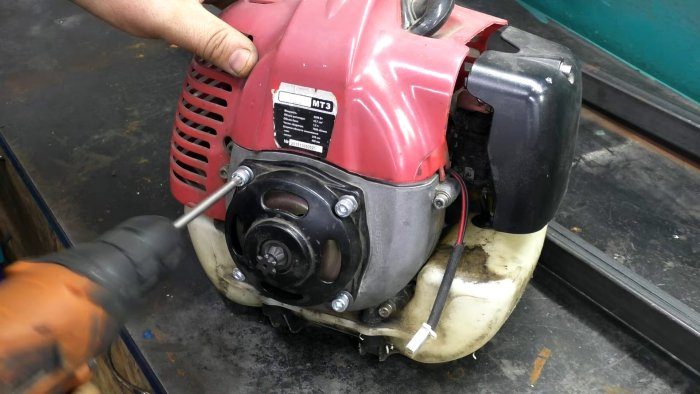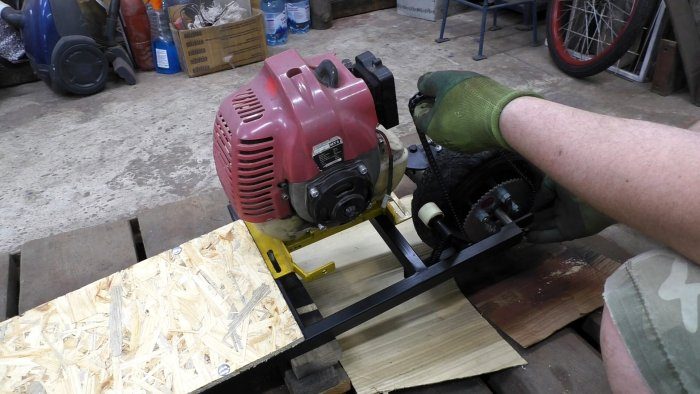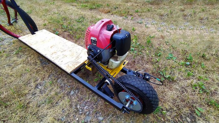 Процесс изготовления самоката из двигателя мотокосы и велосипедных запчастей