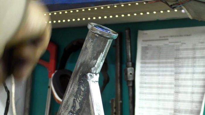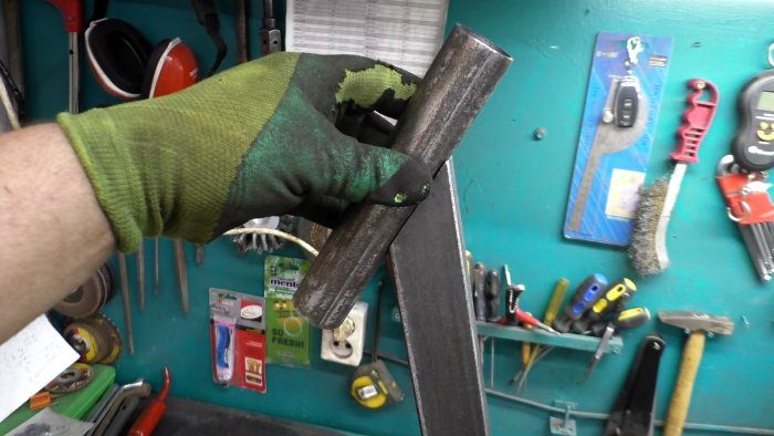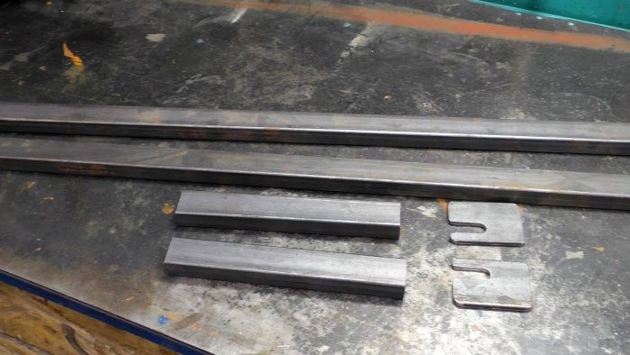 От стальной полосы отрезаем две одинаковые по длине заготовки, выполняем глухие прорези со смещением и скругляем углы. Привариваем их, прикладывая сбоку к концам профильных прямоугольных труб так, чтобы прорези смотрели наружу.