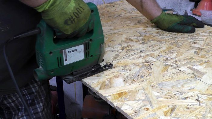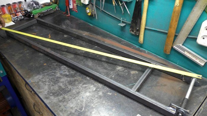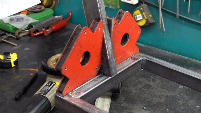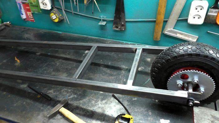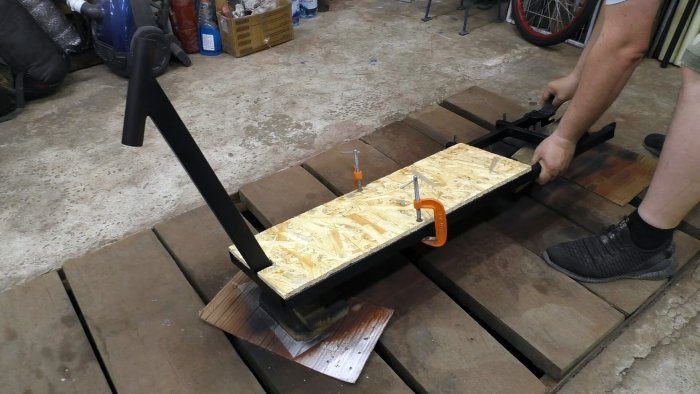 К центру передней поперечины основной рамы привариваем стойку с наклоном вперед, а к ней – трубу для сборки узла поворота велосипедной вилки. Из плиты OSB вырезаем прямоугольник, соответствующий по контуру и размерам основной раме.