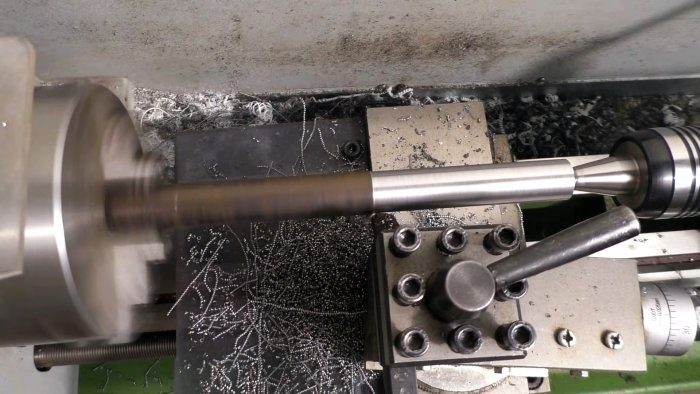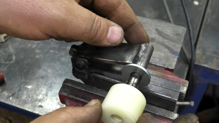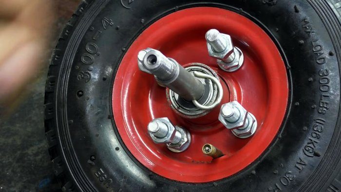 Вытачиваем по чертежу ось колеса на токарном станке и на концах нарезаем резьбу. С помощью шайбы, вырезанной из листового железа, поперечного отверстия в оси согласно чертежу и пружинного шплинта зафиксируем колесо на оси.