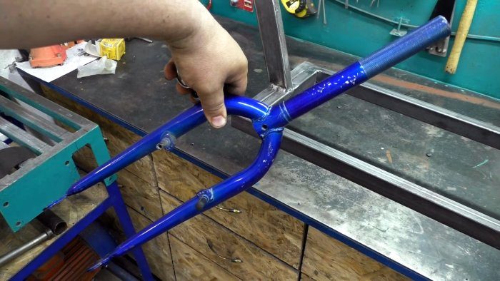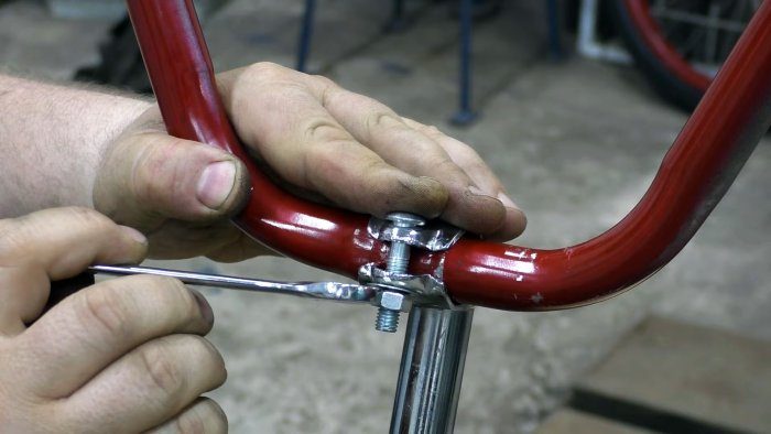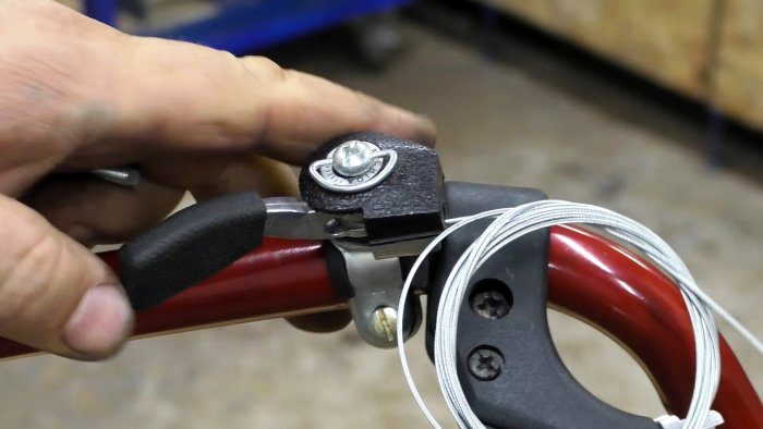 Собираем узел поворота велосипедной вилки, стойку, вынос и руль. Монтируем на руле рычаги управления двигателем и тормозным механизмом, соединив их с соответствующими узлами гибкими тросиками в защитной оплетке. На концах руля закрепляем клеем грипсы.
