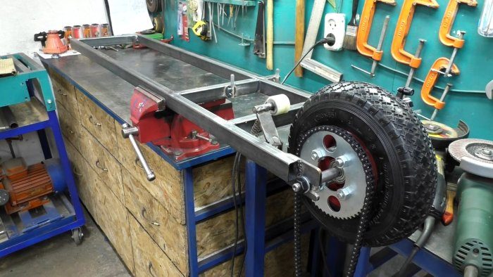 С помощью поперечин также из профильных прямоугольных труб свариваем раму, установив на место ось колеса, и выверив диагонали. Снимаем с двигателя мотокосы колокол с чашкой сцепления и возвращаем привод и ведущую звездочку на место.