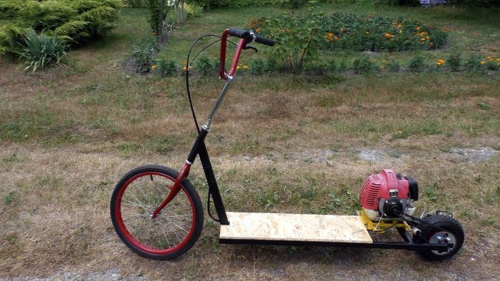 Двигатель от мотокосы и запчасти от старого велосипеда могут стать основой для сборки моторизованного самоката. Для этого не нужны особые знания, профессиональный опыт и большие затраты.