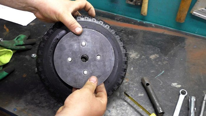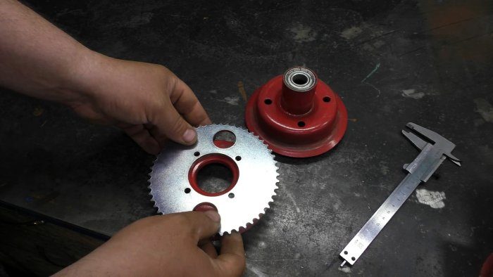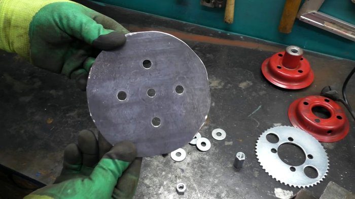 Стравливаем давление из шины и разбираем ступицу. Увеличиваем диаметры 4-х отверстий на ведущей велосипедной звездочке и в ступице. Позже звездочку поместим на ступицу и стянем болтами и гайками.