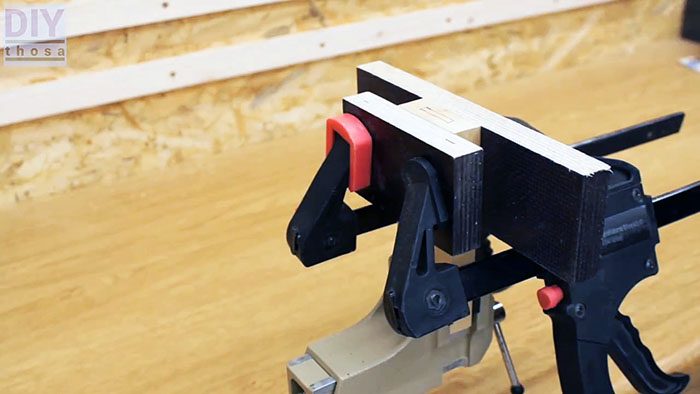 Для того чтобы избежать появления сколов и расщепления плашки, аккуратно зажимаем её между двух деревянных брусков с помощью струбцин. В таком виде производим фрезерование по предварительно сделанной разметке.