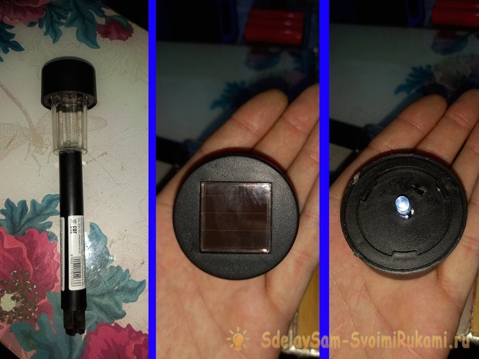 Приобрел я этот фонарик за 99 руб. в первом попавшемся магазине, где продают садовый инвентарь, семена, и прочие принадлежности для огорода и сада. Итак, откручиваем у фонарика головную часть, и крепим ее горячим клеем к внутренней стороне крышки, солнечной панелькой кверху, вот так: