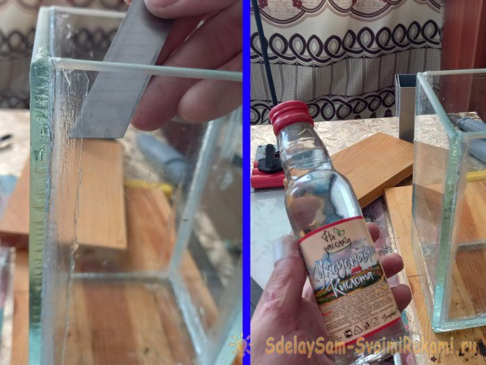 Теперь, выждав нужное время, приступим к очистке аквариума от случайных капель и мазков герметика. Смачиваем в растворе воды и 70-ти процентного уксуса (50×50) ватный диск, и оттираем небольшие мазки. Крупные потеки и капли удаляем лезвием ножа.