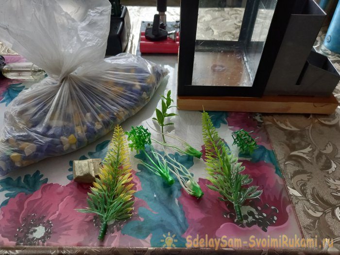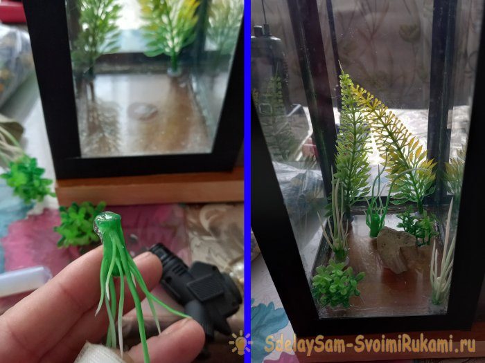 Далее, при помощи все того же горячего клея, крепим ко дну искусственные водоросли, и другие элементы декора, и засыпаем грунт.