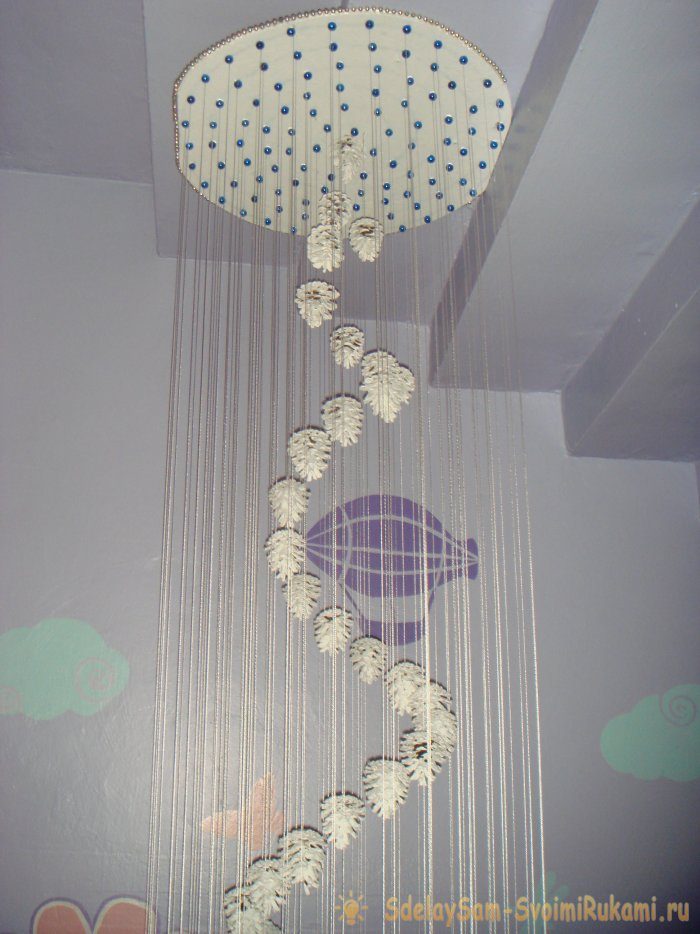 Дальше круг покройте той же белой краской, что осталась после покраски шишек. Затем в каждую дырочку приклейте 1 длинную нить. Концы нитей фиксируются к кругу горячим силиконом из термопистолета. В каждую нить проденьте 1 синюю бусину и зафиксируйте у основания. Каркас готов!