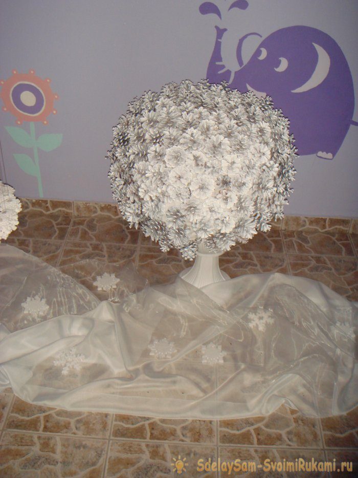 На помощь придут сосновые шишки. Вылазку в лес нужно сделать еще осенью, желательно до наступления холодов. И собрать побольше шишек. Дома их необходимо разложить в один слой возле батареи и просушить. Когда чешуйки станут ломкими, это будет означать, что материал готов к использованию. Высушенные шишки надо покрасить белой краской из баллончика. Работать следует в подсобном помещении или хотя бы на лестничной клетке. После того, как краска полностью высохнет, можно приступать к творчеству.