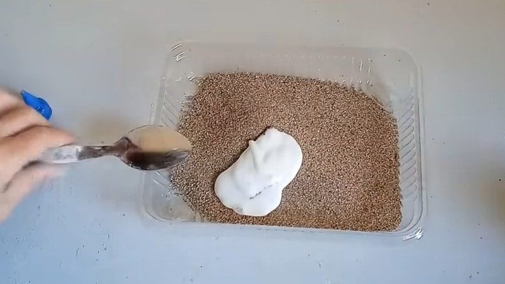 Теперь добавьте в песок пару столовых ложек муки и клей ПВА. Клея должно быть столько, чтобы после тщательного перемешивания получилась достаточно пластичная полутвёрдая масса.