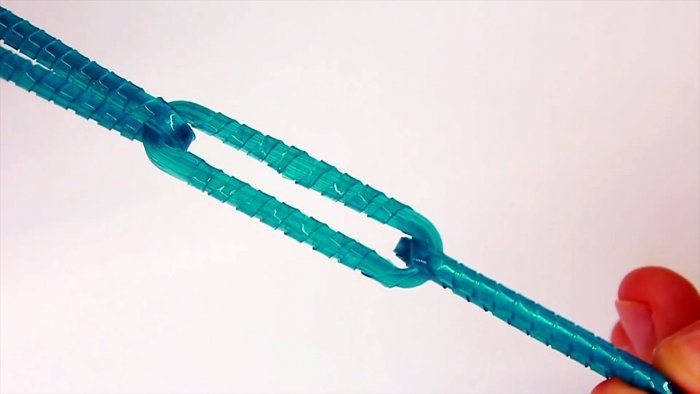 Данным способом можно сделать цепь любых параметров. Если требуется увеличенная прочность, то нужно наматывать больше слоев ленты. Величину звеньев можно регулировать, применив шпильку с большим или меньшим зазором. Получаемая в результате цепь почти ничего не весит, при этом она очень крепкая, смотрится необычно, не ржавеет.