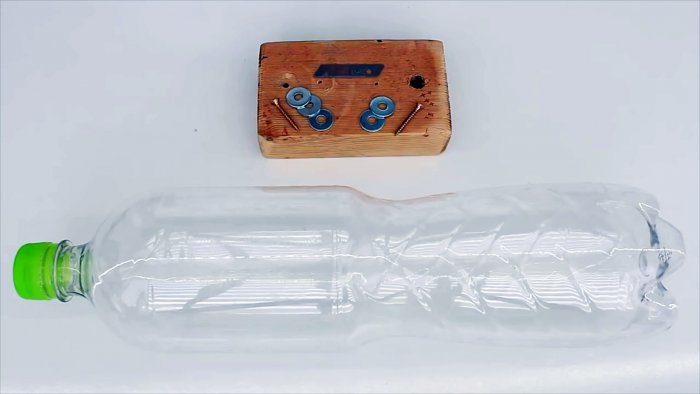 Сначала нужно сделать станок для нарезания пластиковых бутылок на ленты. Для этого лезвие ножа прикручивается саморезом через отверстие к дощечке. Предварительно под него подкладывается 2 шайбы. Второй его конец поджимается также, но поскольку на нем нет отверстия, то нужно подложить 2 шайбы снизу и одну сверху.