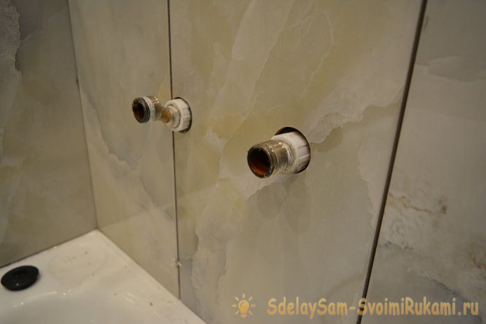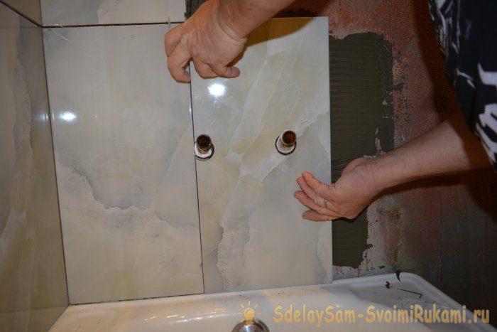 При укладке кафеля в районе водопроводных соединений вам потребуется проделать в плитке отверстие.