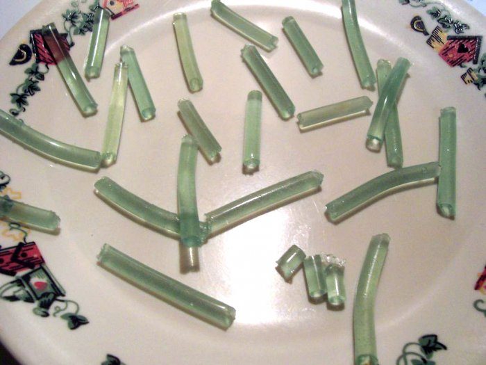 После застывания желатина достаю приманки из трубок. Чаще всего застывшие кусочки желатина выскакивают из коктейльных трубок легко (выталкиваю их толстой спицей), но некоторые приходится разрезать, чтобы достать содержимое.