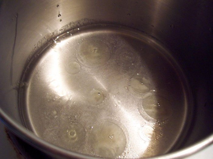 Вода ставится на медленный огонь и слегка подогревается.