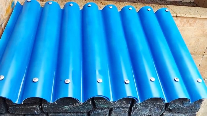Изготовив таким образом достаточное количество изделий, соединяем их в пластиковый волнистый шифер перекрытием половинок. Для придания жесткости и сохранения формы соединяем их по краям двойных волн шурупами или заклепками, предварительно просверлив отверстия с помощью дрели.