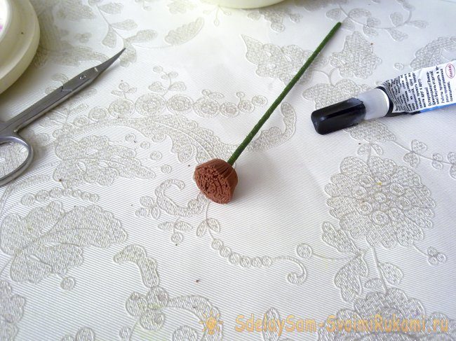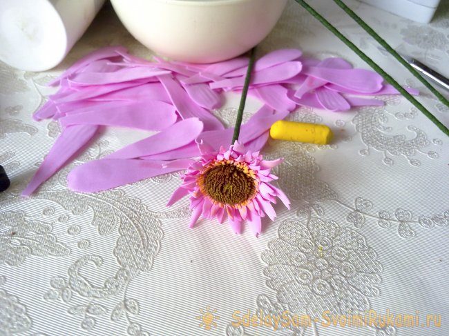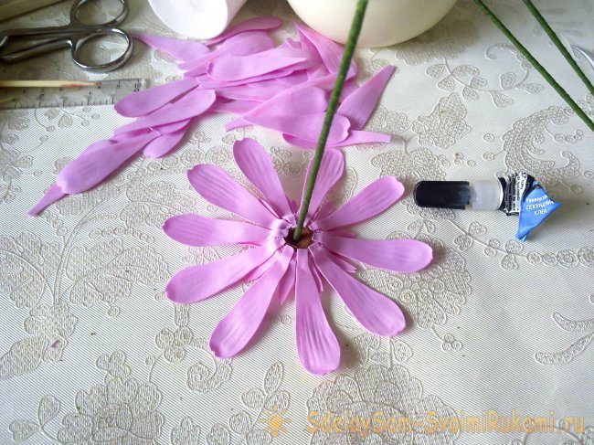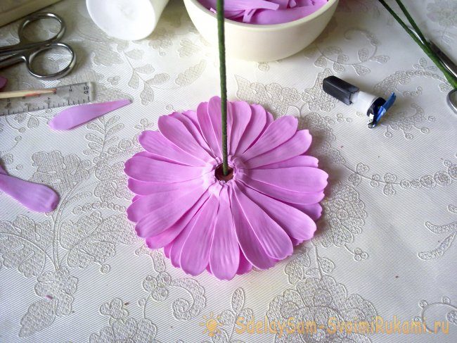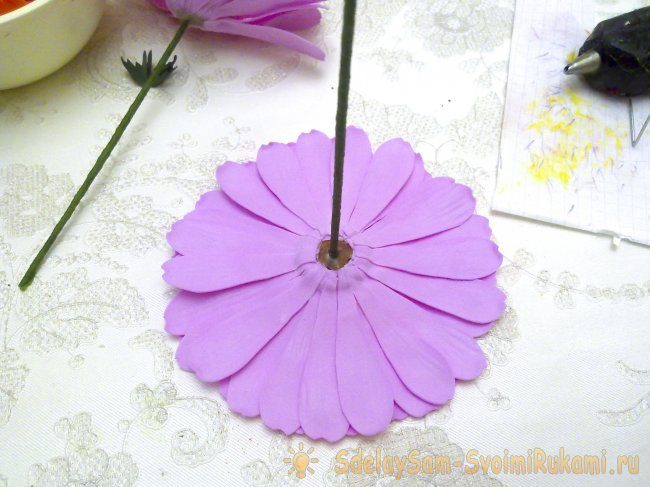 Заливаем жидким клеем основание герберы.