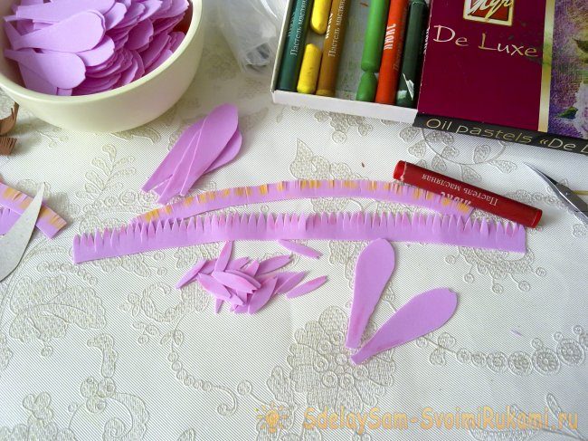 Из розового фоамирана выкраиваем одну полоску 1,3х15 см, нарезаем бахрому, как у коричневой. Вторую розовую полосу отрезаем чуть шире и длиннее — 1,5х18 см, нарезаем её зубцами. Не бойтесь сделать полоски длиннее, лишнее всегда можно отрезать. А вот если не хватит, то придётся выкраивать недостающую длину.