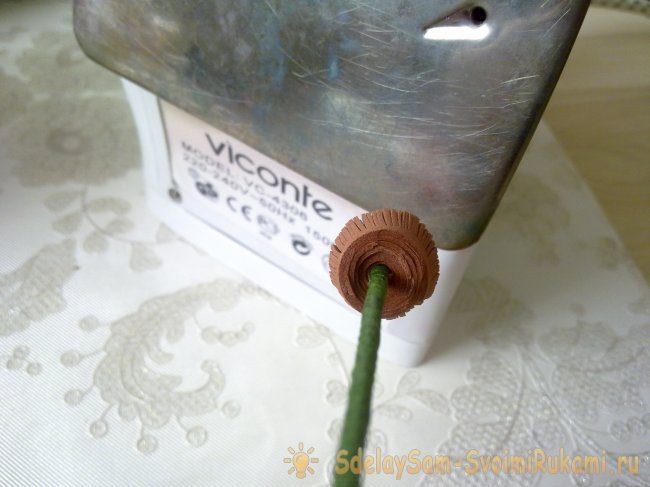Прикладываем к нагретому утюгу коричневую серединку. Затем прислоняем бочком для того, чтобы нарезанные кончики выгнулись от центра.