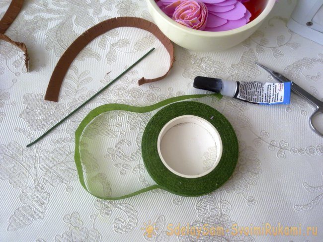 С помощью секундного клея фиксируем начало коричневой полоски к проволоке и начинаем скрутку, не забывая смазывать клеем.