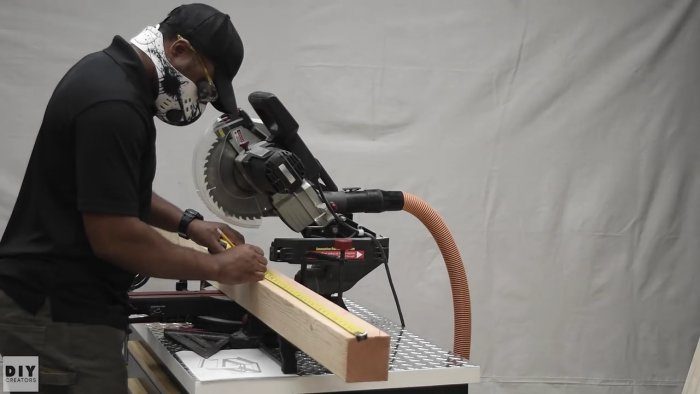 Определившись с габаритами кресла, отмериваем на выбранном брусе требуемую длину с учетом обработки и размечаем ее, применяя строительную рулетку, металлический треугольник, подходящий карандаш или маркер.С помощью маятниковой пилы разрезаем брус на заготовки, одновременно подравнивая их торцы. Для выбранной нами конструкции кресла понадобятся 16 заготовок большого сечения квадратной формы и 2 бруска со сторонами в два раза меньше, чем у основных заготовок.