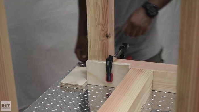 На них укладываем на клей три продольных бруса с пазами в половину дерева, используя шаблоны, задающие одинаковое расстояние между ними, и закрепляемыми временно струбцинами.