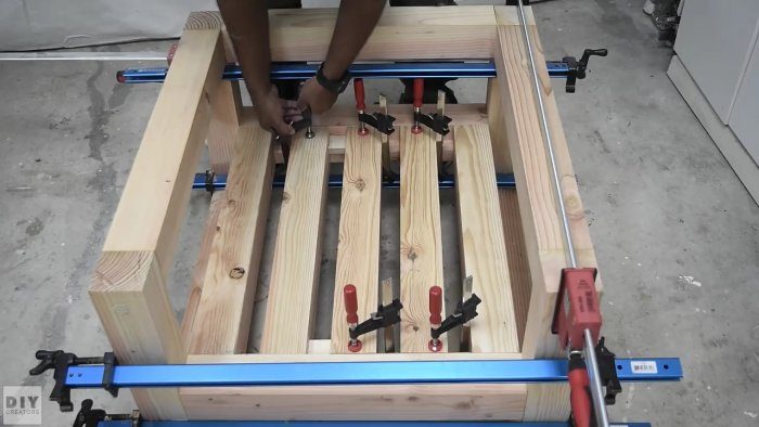 В пазы на клей закрепляем брус меньшего сечения, фиксируем струбциной и прикручиваем их двумя-тремя винтами каждый к поперечным элементам каркаса сидения.