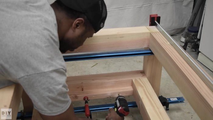 Стягиваем конструкцию в направлении поперечин регулируемыми по длине струбцинами и укрепляем перекрестия стяжными винтами.