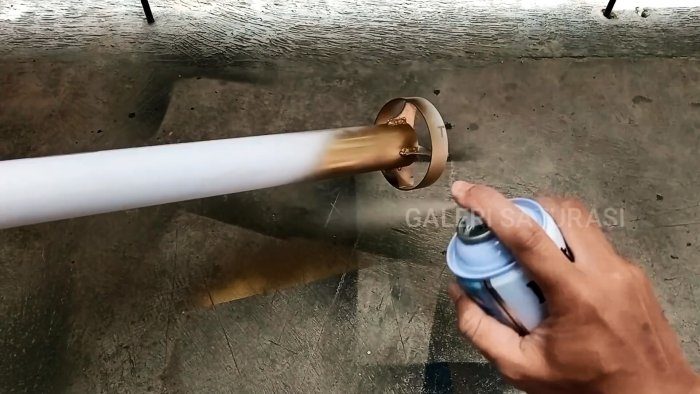 Собираем полученные детали согласно задуманной конструкции посредством суперклея. Трубу и кольцо с крестообразной вставкой выкрашиваем в золотистый цвет, а остальные составляющие светильника – в черный цвет.